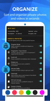 Ufikiaji wa kasha lako la siri la LockMyPix umelindwa kikamilifu kwa chaguo mbalimbali za kuingia, ikiwemo PIN, nenosiri, muundo, au hata alama za vidole, kukupa urahisi na usalama kwa wakati mmoja. Huhitaji kuwa na wasiwasi kuhusu nafasi; programu hii inakuwezesha kuficha na kulinda idadi isiyo na kikomo ya picha na video zako zote muhimu. Ongeza kwa urahisi maudhui yoyote kwenye kasha lako, na yatahifadhiwa papo hapo kwa njia salama na ya faragha. Zaidi ya hayo, LockMyPix inatoa usaidizi kamili kwa kadi za SD, kuunda albamu na vijialbamu bila kikomo, na hata inakubali faili za GIF, ikihakikisha mahitaji yako yote ya uhifadhi wa media yanatimizwa.
